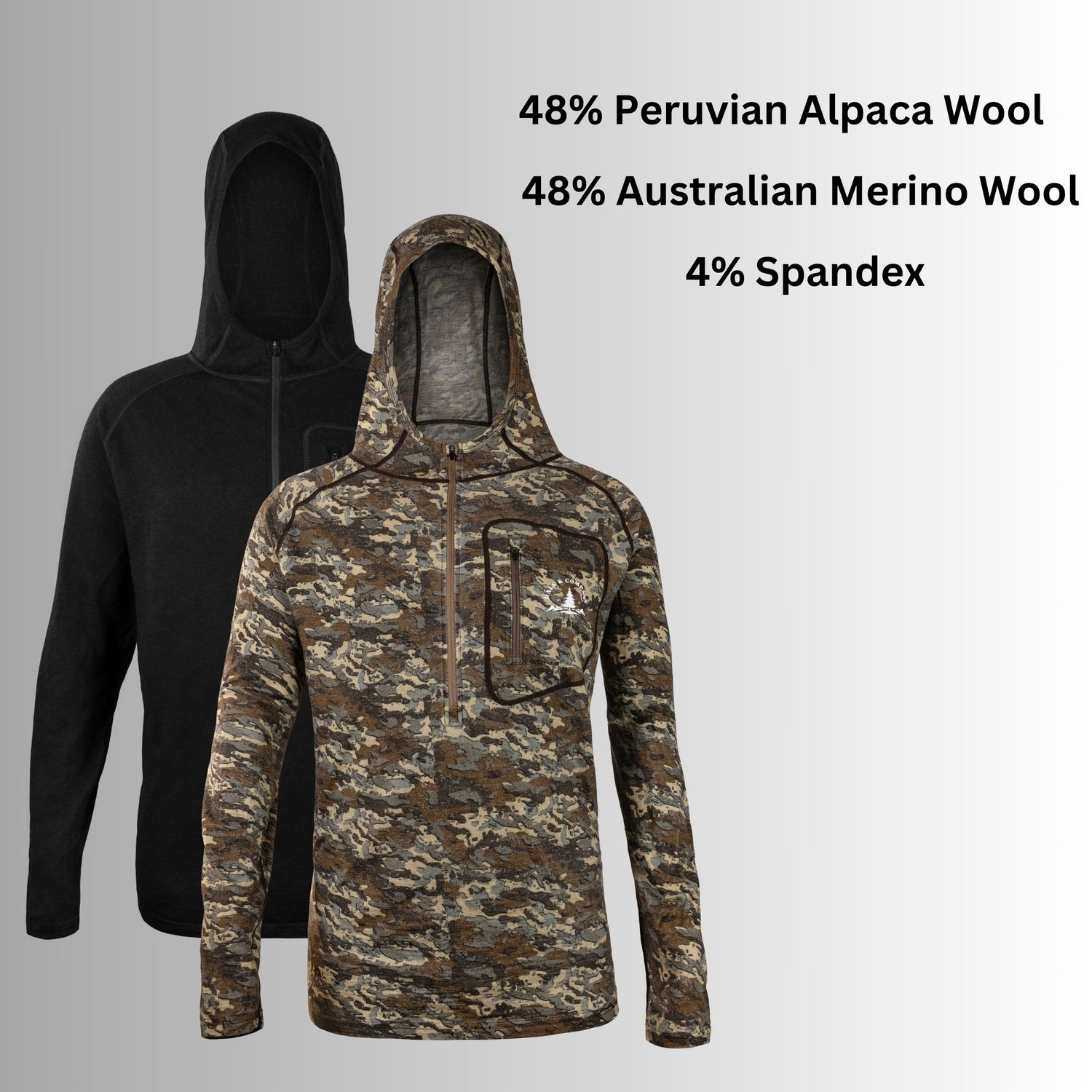 The Alpaca Hoodie 210 series was developed for the most demanding excursions. Here's the scenario, you depart camp before daylight, the temperature is below freezing but, you have not layered up because of the 2000' climb ahead. Season after season, before we started testing Alpaca wool we would arrive at our honey hole usually 3-4 degrees colder now due to elevation, soaked with sweat, Sometimes even having to change into a new base layer. At this point transitioning from hiking to stalking, and the amount of physical exertion declines. Our bodies stop dumping excess heat, and now want to retain it. If you have ever been in this situation then you know being drenched and borderline hypothermic isn't ideal for stalking your quarry. The Alpaca Merino blend, wicks moisture taking advantage of alpaca wool's hollow fibres which are hydro phobic and merino's wicking properties. This keeps you dryer, warmer and needing less layers. The breathable fiber blend prevents overheating during active pursuits, while the warm alpaca wool keeps you cozy during long days. Unlike synthetic materials, our wool blend stays warm even when damp - a key feature for unpredictable weather. With its unisex design and options for small, medium, large, or XL, everyone will find their ideal fit. Offered in black for ultimate versatility, and camo. Dale & Company’s high-contrast macro pattern features a carefully curated blend of tan, grey, brown, and black tones, designed for ultimate concealment in diverse terrain. The pattern maintains breakup, ensuring you remain undetected in a variety of environments. Engineered for year-round use, it excels in sub-alpine and alpine terrain, all season hunting conditions, old growth forest, transitional areas, weathered grey rocks, and sparse tree covered alpine environment providing exceptional performance in the most challenging outdoor conditions. Perfect for hunters, adventurers, and those navigating demanding environments.